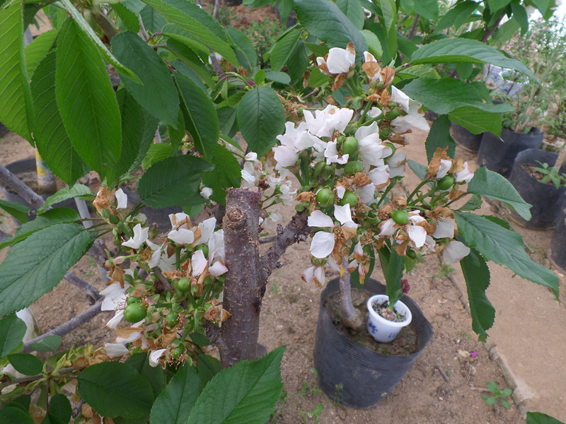 櫻桃屬于異花授粉的果樹,在盆栽過程中注意品種搭配,最佳辦法是每盆嫁接2~3個品種。上盆的櫻桃應(yīng)選擇果個大、色澤艷麗、連續(xù)結(jié)果能力強(qiáng)的品種。